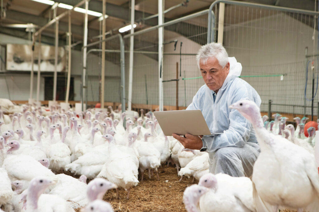 Using technology in a modern turkey farm to help the farm improve the birds’ sustainability and animal health. Getty images