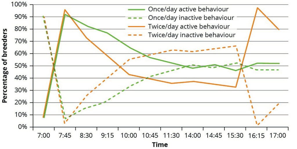 Implementing twice-a-day feeding results in a different activity pattern throughout the day (Figure 1). Due to the second feeding time in the afternoon, breeders are more active during the last 4-5 hours of the light period. Observations of mating behaviour indicate that the majority of matings occur at the end of the day. The last 4-5 hours are biologically and physiologically the optimal time for egg fertilisation. Increased activity, particularly the mixing of females and males in the afternoon, leads to more mating activity, thereby promoting better fertility persistence as birds age.
