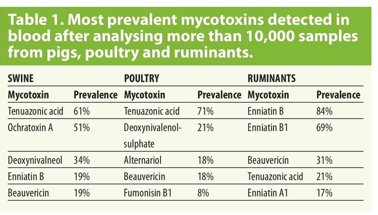 Traditional routine programmes focus on regulated toxins such as aflatoxin, deoxynivalenol, fumonisin and zearalenone. In recent years, advances in LC–MS/MS technique have made it possible to expand the range of mycotoxins analysed. Thus, numerous scientific feed surveys have since shown that emerging mycotoxins, such as beauvericin and tenuazonic acid, are among the most prevalent contaminants worldwide (Table 1).