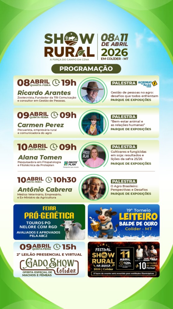 Entre os dias 8 e 11 de abril, a cidade de Colíder, no Mato Grosso, recebe a edição 2026 do Show Rural. O evento, que tem apoio da JBS Friboi, reúne empresas, produtores e profissionais do setor para apresentar tecnologias, máquinas e soluções voltadas ao agronegócio.