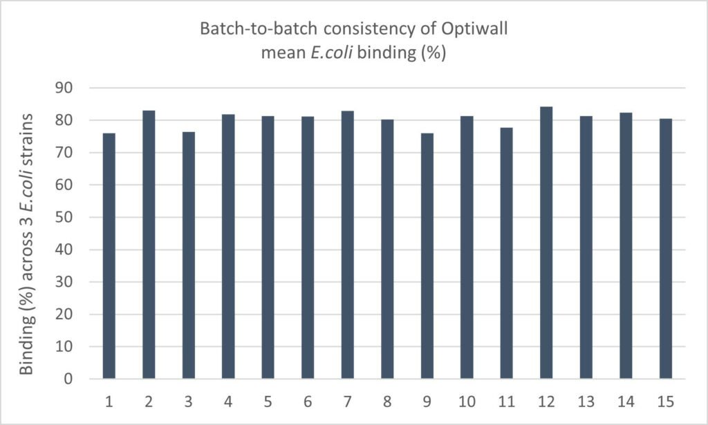 Figure 1 – Across 15 production batches, Optiwall demonstrated an average pathogen-binding rate of 80.4 ± 2.65% (mean ± SD, n = 15), confirming strong consistency and process reliability (Lallemand, internal data, 2025).
