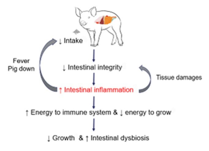 The set of inflammation is part of the innate response of the immune system. It is necessary to fight exogenous pathogens. However, if not controlled, it can become detrimental for the organism and damage tissues. As shown in the figure above, inflammation can also cause fever. The pig is down and does not eat, which fuels this vicious circle once again, leading to growth reduction.